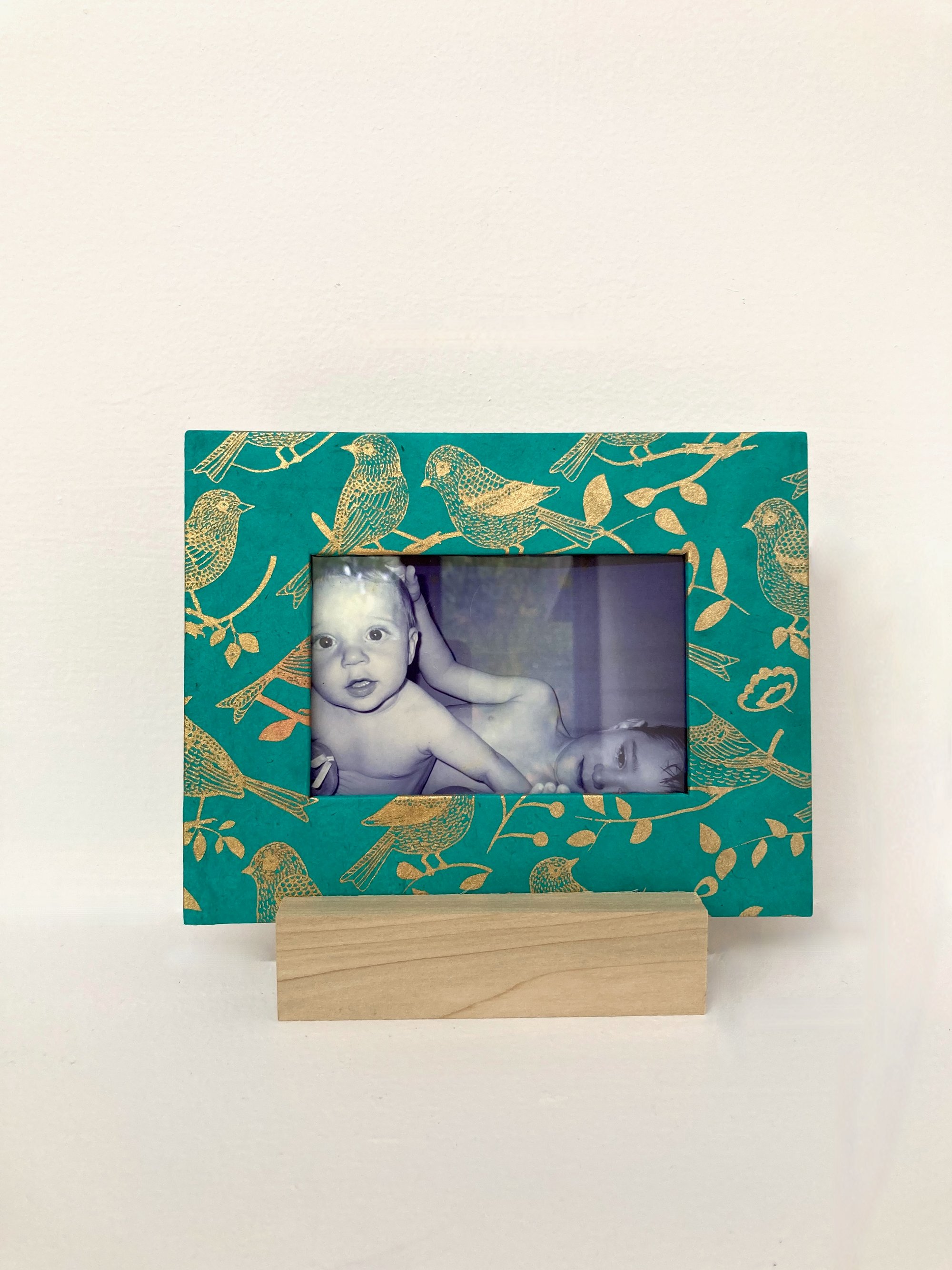 picture frames were the very first designs i made and sold after art school and this frame was conceived in 2003. it's design features a glass cover, tabs in the back for tucking the photo under and a wood block to hold the frame. i make these in many different patterns and it has been a customer favorite for 2 decades now! this is a standing frame and can be positioned horizontally or vertically (if the pattern allows)