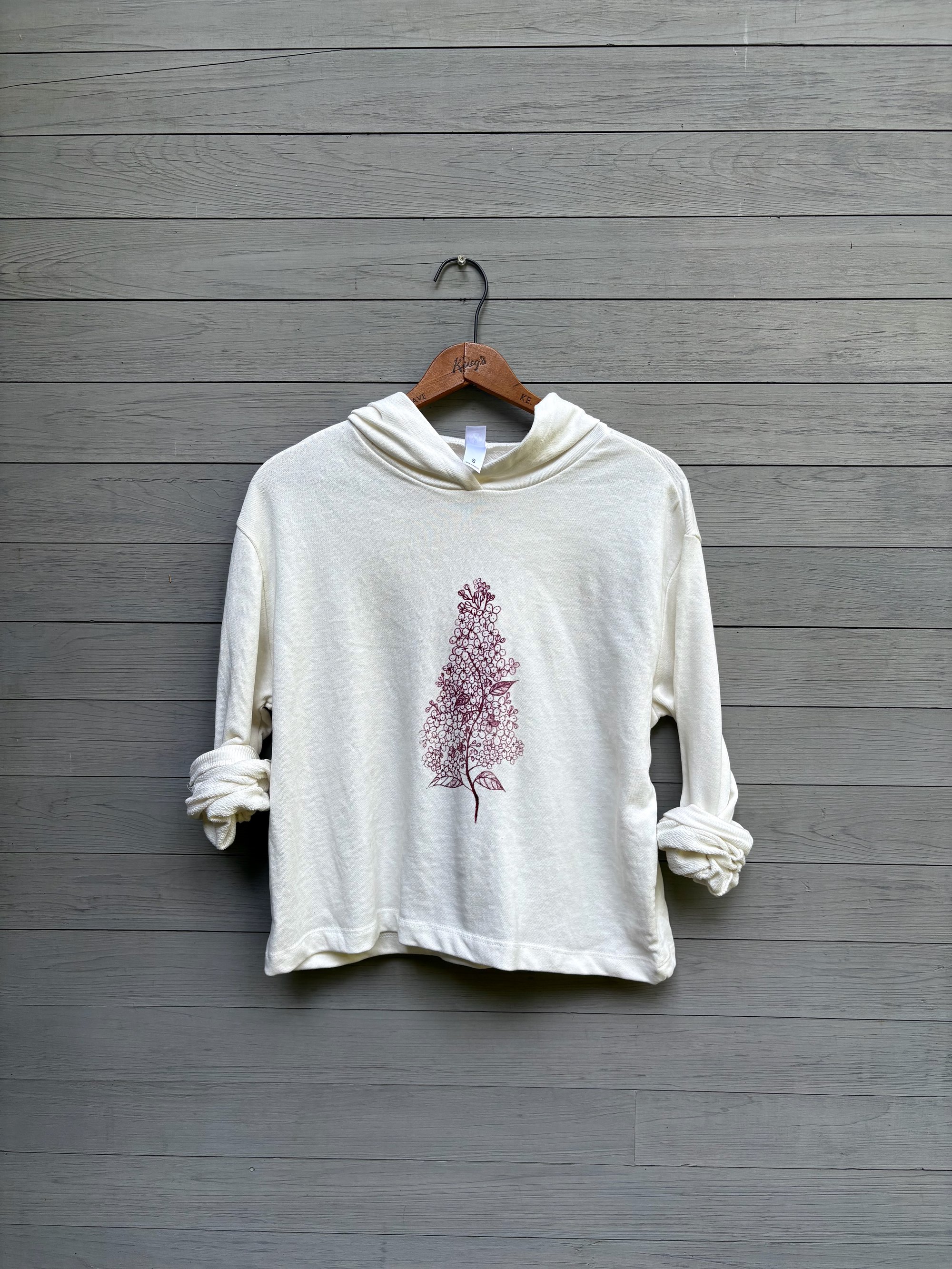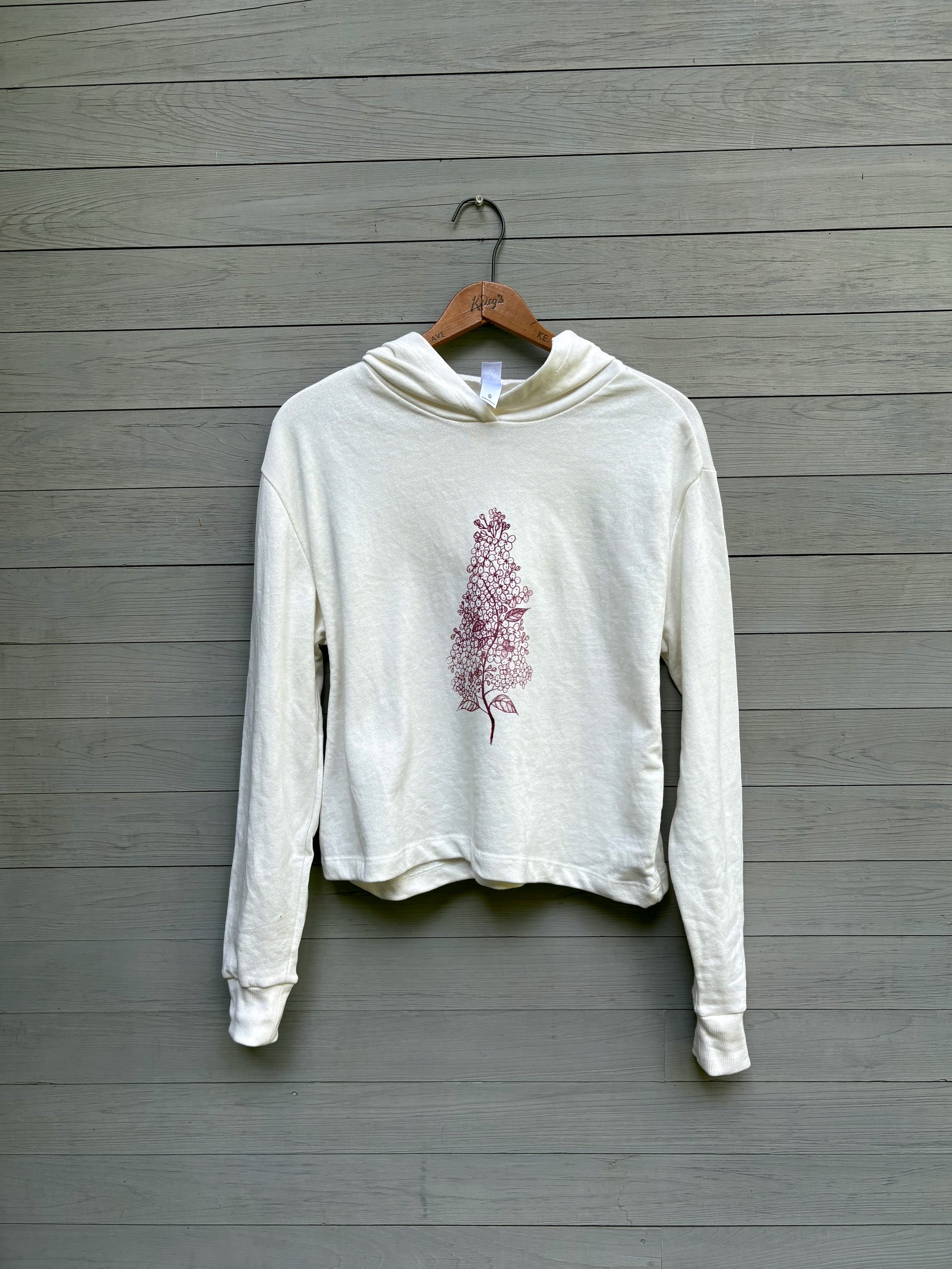 Style: women's cropped hoodie has a broken in feel. cotton + recycled poly